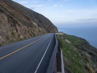 This image captures the beauty of a coastal sunrise in California, USA. The early morning light illuminates the rugged terrain and mountain pass. A winding road with asphalt surface runs along the cliff, providing a stunning view of the ocean. The clear sky above is adorned with contrails. The image showcases the natural landscape and the infrastructure of the coastal area. The road is lined with an Armco barrier that separates it from the rock wall. This is the perfect representation of a picturesque dawn on the California coast.