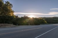 This is an image of a rural landscape at dawn. The asphalt road winds through the highlands, surrounded by trees and vegetation. The sun is visible on the horizon, casting a bright light and creating long shadows. The road surface is illuminated by the sunlight, creating a hard shadow. A guard rail and Armco barriers are visible along the slope of the road. This picture captures the serene beauty of the countryside at the break of day, with clear skies and sunny weather.