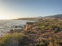 This is an image of the California coastline at dawn. The coastal landscape features sandy beaches, grassy hills, and open spaces. The highland vegetation adds to the natural beauty of the area. The clear sky and horizon are reflected in the calm ocean waters, creating a serene atmosphere. The headlands and shorelines provide a glimpse of the wilderness. This photo captures the essence of California's natural environment, with its high, elevated landscapes and stunning coastal views at the break of day.
