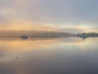 there are boats in the water with sunset and fog rising in the background behind them