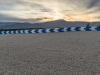 A sunrise on an open race track in the USA. The asphalt road curves through the open space, with the sun visible in the profile. Clouds add drama to the sunny and bright atmosphere.