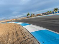 This is an image of a race track at dawn in the USA. The asphalt road curves through the landscape, creating an exciting racing environment. The sky is filled with clouds, adding drama to the scene. This photo captures the break of day as racers prepare for a thrilling race.