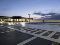 This is an image of a modern architecture parking deck at dawn in Berlin, Germany. The open space is surrounded by trees and highlighted by the artificial light of the parking deck. The asphalt road surface creates a line leading towards the horizon. The reflection of the light creates shadows, adding depth to the image. This photo captures the atmosphere of an evening in Berlin, with the combination of natural and artificial light. The modern architecture and infrastructure highlight the city's urban landscape. This image represents the break of day in Europe's thriving capital city.