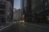 a car on the street that is at sunset on the left bank of the road with tall buildings on the right