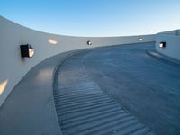 curved stairs are lined around an outside building with bright lights on the walls and cement ground