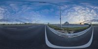 Wide open camera lens captures the dawn over a street corner in Toronto, Canada. Clouds in the sky create a dramatic atmosphere. Residential homes and urban infrastructure line the horizon.