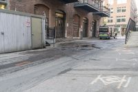 This image captures the break of day in Denver, Colorado, USA. The city's classic architecture and urban design are highlighted in the background, with residential areas and public spaces lining the streets. A green trash truck is parked next to an industrial building, reflecting the city's infrastructure. The road surface is made of asphalt and concrete, framed by sidewalks and curbs. The building's facade and windows add to the charm of the scene. This photo represents a typical day in Denver, showcasing the combination of city life and classic architecture.
