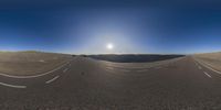 A scenic view of a desert landscape in Holland, with a small highway leading towards the horizon. The sun casts a warm light on the road, creating a beautiful silhouette of a truck. A perfect spot for kite sports and windsurfing in Europe.