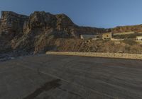 This stock photo captures a breathtaking view of a desert landscape in Portugal. In the center of the image, there is a large red sign standing tall amidst the vast expanse of desert terrain. The rocky bedrock formations in the foreground add an interesting texture to the scene. The clear sky and the dawn light create a stunning display of colors, illuminating the mountainous highlands in the distance. The open space and the coastal proximity provide a sense of tranquility, making it a perfect image representing the natural beauty of Europe.