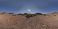 A person stands in the middle of the rugged desert landscape of Utah, surrounded by dirt and red rock formations. The clear sky overhead contrasts with the elevated island in the distance. A picturesque scene in the natural environment of Canyonlands.