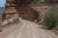 A rugged off-road track in Utah's desert landscape. The old dirt road snakes through red rock formations and brown sand streets. Vegetation and shrubs dot the landscape. Explore the rugged terrain of Shafer Trail.