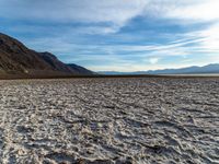 the mountains are next to the dry lake in the desert at sunset - looking down into the water