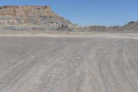 A day in Utah's San Rafael Swell, with its rugged and sloped terrain. The open space is filled with red rocks and beige sand. The clear sky contrasts with the natural formations, creating a stunning desert landscape.
