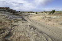 This stunning aerial photo captures a desert trail in Utah, USA. The trail follows a gentle curve through the red rock landscape of San Rafael Swell. In the background, you can see trees and vegetation scattered amongst the sandy terrain. The clear blue sky and fluffy clouds provide a beautiful backdrop to this rugged and scenic landscape. The road surface is a mixture of dirt, sand, and gravel, adding to the wild and natural feel of the scene. Experience the untouched beauty of nature as you explore this vast and captivating desert.