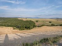 A person standing on a dirt path in Tuscany, Italy, with their bike in hand. The rugged landscape of Europe is highlighted by the clear sky. Fields and buildings in the distance give a sense of rural charm.