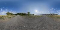 the view of a large dirt road, with grass, bushes and a sun in the sky