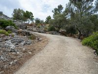 A dirt road winds through the mountains of Mallorca, Balearic Islands, Spain. The rugged landscape is dominated by rock walls and gravel surfaces. Clouds loom overhead, adding drama to the European nature scene.