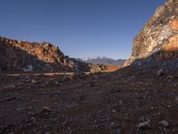 A rugged dirt road cuts through the mountainous landscape of Shangri-La, Yunnan, China. The clear sky contrasts with the Mars-like rock formations, creating a unique and breathtaking scene reminiscent of an off-road adventure.