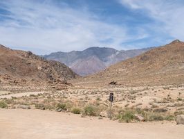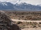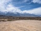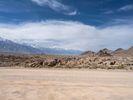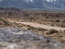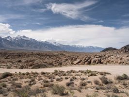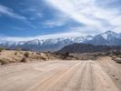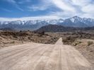 Dirt roads amidst the desert landscape of Alabama Hills, California. Clear sky illuminates gravel paths and open spaces. Mountainous terrain offers off-road tracks for adventure seekers.