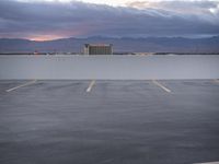 A view of downtown Las Vegas at dawn, with modern architecture and a clear sky. The cityscape is reflected in a parking lot, surrounded by mountains. The grey concrete surfaces contrast with the open spaces and water resources.