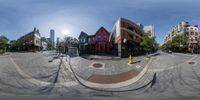 A panoramic view of downtown Toronto, Ontario. Classic architecture and mixed-use buildings line the streets. Pedestrians walk along cobblestone walkways and cross zebra crossings. Hard shadows add depth to the monochrome scene.