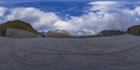 A dramatic and breathtaking view of the Austrian highlands. The fish eye lens captures the majestic mountain range, with a grey backdrop of clouds and a winding road leading to the destination. Nature and adventure await in Europe.