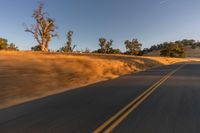 A car rides along an asphalt road near a dry grass field at dusk. The clear sky and sunlight create a beautiful landscape. The road surface contrasts with the surrounding vegetation.