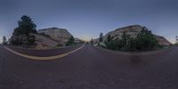 a fish eye lens shot showing the road passing in front of two large rocks at dusk