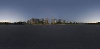 the view of the city skyline from across a runway at sunset time - 3d illustration