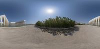 A road in Egypt under a clear sky, with modern architecture lining the urban street. Gravel and sand mix on the surface creating a unique texture. Palm trees and shadows add character to the scene.