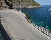 An elevated road along the coastal area of Spain, with clear skies and views of the high ocean. The road leads to a pier and harbor, with an Armco barrier for safety. This scenic drive showcases the beauty of the Balearic Islands in Europe.