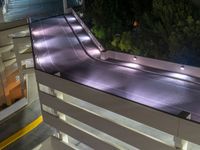 Top down aerial view of an elevated road in Los Angeles. Artificial lights illuminate the long slide, creating a mesmerizing display at night. Cars can be seen traveling along the road, giving a sense of activity. This urban scene captures the bustling energy of the city.