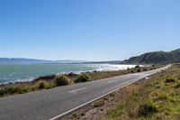 An elevated road in New Zealand runs alongside the stunning coastal landscape. The clear sky reflects on the asphalt surface as it stretches towards the ocean. Nature's beauty is amplified by the surrounding mountains.