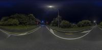an empty road with traffic lights lit by streetlights at night with trees and shrubs