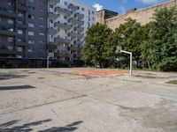 This photograph captures an empty basketball court in the urban art district of Berlin. The court is surrounded by a graffiti-covered wall, adding a vibrant and edgy touch to the concrete surfaces. Located in a courtyard of an apartment complex, the rugged charm of the Hinterhof shines through. With its open space and urban design, this basketball court is the perfect spot for sports enthusiasts to showcase their skills. This image reflects the energetic and artistic atmosphere of Berlin, a city known for its dynamic street art scene and rich cultural heritage.