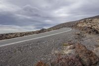 An empty country road winds through an open desert landscape, with a mountain peak in the distance. Under a gloomy grey sky, the road curves and offers an overview of the scenic terrain.
