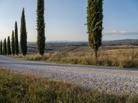 trees line an empty country road near the mountains and trees in tuscany, italy, europe