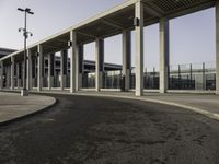the curved asphalt pathway is empty and concreted near the station entrance of an industrial building