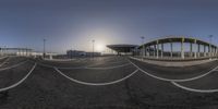 a fish eye lens view of the parking lot and outside of airport buildings that are empty