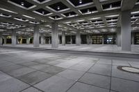 An empty concrete parking lot at night, surrounded by a building with columns and suspended lights. The interior design of the building features open hallways and large windows, creating a spacious and well-lit atmosphere.
