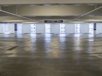 This modern architecture building in Los Angeles, California, USA features an empty parking lot with signs on the ceiling and windows. The spacious lot is situated in the middle of the building, offering convenient parking options. The concrete street and parking deck provide a sturdy foundation, while the gas fixtures and lighting fixtures ensure safety and visibility. This bright and open parking garage is perfect for any day-time adventures or business endeavors.