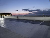This stock photo features an empty parking lot in Berlin, Germany during the evening. The lot is illuminated by street lights, and in the background, you can see a modern and architecturally stunning building with lights shining through. The sky is filled with clouds at dusk, creating a mesmerizing atmosphere. The combination of the modern architecture, the vast open space, and the cloudy horizon makes this image perfect for conveying a sense of technology and progress in Berlin, Europe.