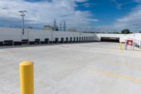an empty parking lot with many yellow caution poles near a factory building and lots of trucks