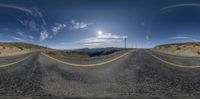 the empty road with mountains in the background is being distorted by an image of a sky