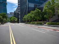 Empty road in Taipei City, lined with futuristic skyscrapers and modern architecture. Clear sky contrasts with the vibrant urban design of Asia. A glimpse of Taipei's city life.