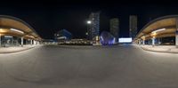 a empty road is seen at night with tall buildings in the distance and street lights in the foreground