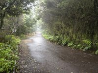 an empty road surrounded by lush vegetation and tall trees on a rainy day in the park