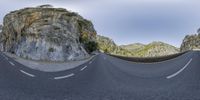 Aerial view of two empty roads in Mallorca, Balearic Islands. The roads twist and turn through the mountainous landscape, surrounded by rock walls and lush vegetation. Clear skies and an elevated perspective offer a top-down view of this stunning European scenery.