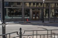 This stock photo features an empty street corner in downtown Toronto, Canada. The image showcases a classic architecture building with closed glass windows and a profile column. The asphalt road and concrete sidewalk create an urban design. The foreground includes a door, shade, fence, and iron metal elements. The public space is quiet and deserted, adding to the serene atmosphere of the city life. The photo captures the essence of urban living in Toronto during the day.