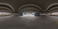 A view of an empty street in the parking garages of Toronto. Urban design with concrete surfaces and asphalt parking lots. Straight down the road, a blue truck with a yellow stripe drives away.